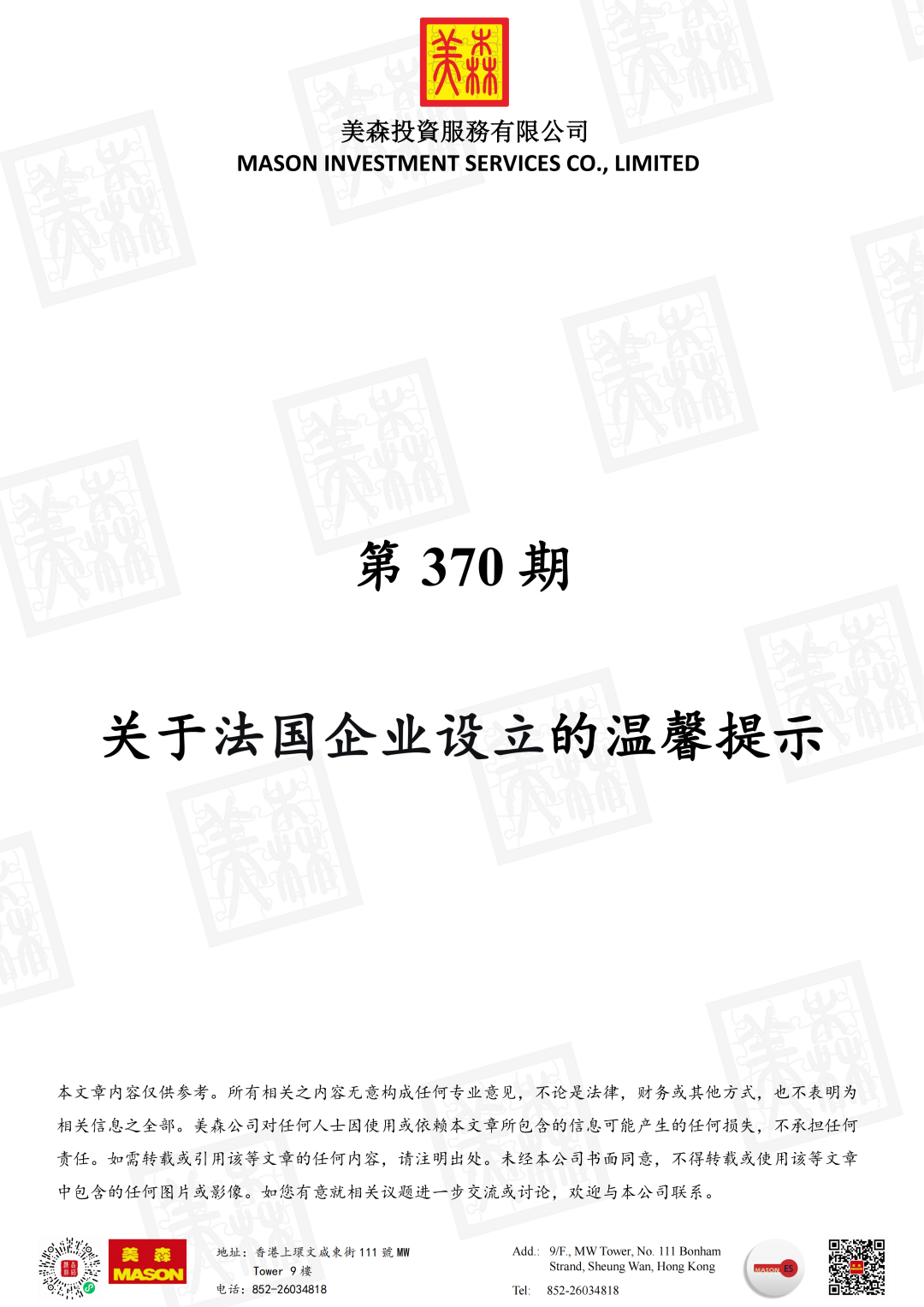 本文章内容仅供参考。所有相关之内容无意构成任何专业意见,不论是法律,财务或其他方式,也不表明为相关信息之全部。美森公司对任何人士因使用或依赖本文章所包含的信息可能产生的任何损失,不承担任何责任。如需转载或引用该等文章的任何内容,请注明出处。未经本公司书面同意,不得转载或使用该等文章中包含的任何图片或影像。如您有意就相关议题进一步交流或讨论,欢迎与本公司联系。